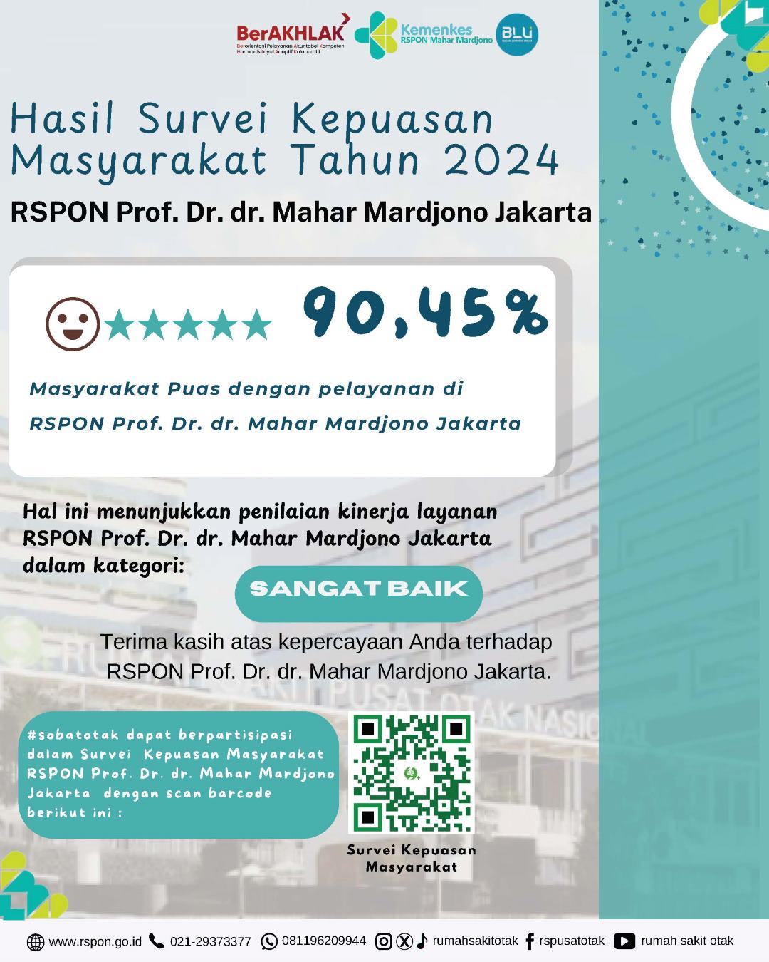 Survei Kepuasan Pelanggan yang dilakukan di Rumah Sakit Otak Nasional secara berkala menunjukkan hasil yang positif. Mayoritas pasien menyatakan puas dengan pelayanan yang diberikan, terutama pada aspek pelayanan dokter dan perawat. Keramahan serta profesionalisme tenaga medis menjadi faktor utama yang diapresiasi oleh pasien. Selain itu, fasilitas yang memadai dan proses pendaftaran yang efisien juga turut berkontribusi pada kepuasan pasien.
